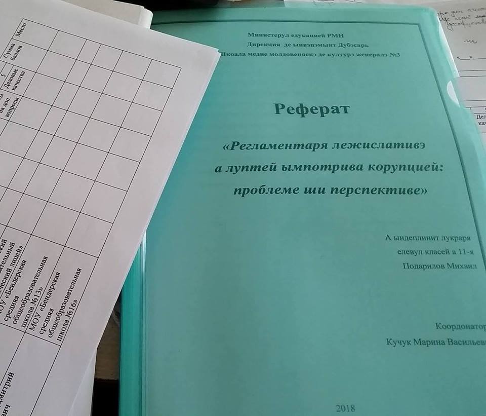 Один из докладов прозвучал на молдавском языке: с темой "Регламентаря леӂислативэ а луптей ымпотрива корупцией: проблеме ши перспективе" ("Законодательное регулирование борьбы с коррупцией: проблемы и перспективы") выступил учащийся Дубоссарской молдавской средней общеобразовательной школы № 3 ПОДАРИЛОВ Михаил Александрович.